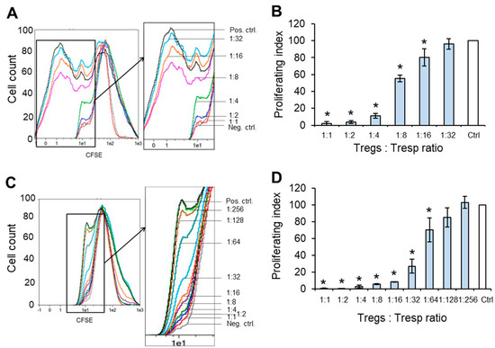 All suppression assays were performed in 96-well round-bottom plates (Sigma-Aldrich, St. Louis, MO, USA) in a final volume of 200 µL/well. Responder CD4+CD25− T cells (Tresp) were obtained from the negative fraction during CD4+CD25+ cell purification and then labeled with CFSE. Labeled cells were cultured at 5 × 104 cells/well with allogeneic mitomycin C (Kyowa Hakko Kirin, Tokyo, Japan)-treated PBMCs, with or without eTregs, in the presence of 5 µg/mL soluble anti-CD3 antibodies for 5 days at 37 °C and 5% CO2 in triplicate. For detection of suppression, CFSE-labeled Tresp cells were analyzed by a MACS Quant analyzer 10, and the number of proliferating cells was determined by the number of cells with a reduced CFSE signal. The proliferation index (PI) was estimated by the following equation: PI = [Tregs: Tresp cocultured/Tresp alone].