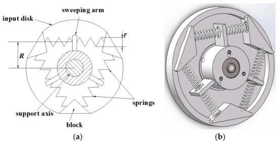 The RSEA consists of five modules: input disk, sweeping arm, support axis, springs, block. The RSEA device of the space robot system is installed between the actuators and the manipulator and is connected to the actuators through its input disk. The block is firmly connected to the input disk. The hollow shaft of the sweeping arm is connected with the support axis fixed on the input disk through a bearing. When the motor rotates it drives the input disk to rotate. Through the block compression spring, the spring transfers the force to the sweeping arm. The hollow shaft of the sweeping arm is directly connected with the manipulator, so as to complete the smooth transfer of motion and force. The general structure diagram of the space manipulator is shown in