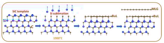 Before delving into the discussion of issues related to deposition of metals and insulators on epitaxial graphene on 4H-SiC, we would like first to recall the peculiar properties of epitaxial graphene that make it appealing to the growth of diverse functional materials. For all cases of the materials growth, which will be considered at a later stage, the common feature is that we used the same type of substrate: monolayer epitaxial graphene (MLG) prepared by high-temperature (~1900 °C) thermal decomposition of the Si-face of nominally on-axis 4H-SiC (0001) substrates in Ar atmosphere [41]. The graphene formation process encompasses three successive stages: (i) initial Si sublimation that takes place in inductively heated graphite enclosure in highly controlled conditions (gas, pressure, time), (ii) C-rich 6√3 × 6√3 R30° surface reconstruction of (0001) face of 4H-SiC (buffer layer formation), and (iii) final formation of topmost graphene layer above the buffer layer. The key stages behind MLG synthesis are illustrated in Figure 1.