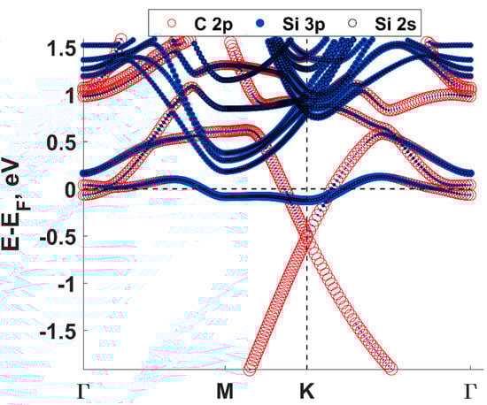 Fat band structure (calculated in the frames of the current work) for monolayer epitaxial graphene on 4H-SiC, including contributions of key orbitals to the bands. The size of each circle is proportional to the corresponding orbital contribution to each band. The Fermi level was set to 0 eV. The band-structure calculations were performed using 32 × 32 × 1 k-point Monkhorst-Pack mesh at vdW/BH/DZP level of DFT by SIESTA code.