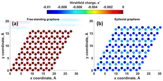 Charge redistribution maps (constructed based on Hirshfeld charges) of (a) free-standing graphene and (b) monolayer epitaxial graphene on 4H-SiC structure. The charge population analysis was performed within this work using 8 × 8 slabs (free-standing graphene and epitaxial graphene on SiC, respectively) at vdW/BH/DZP level of DFT by SIESTA code.