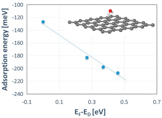 DFT-predicted adsorption energy of a H2O molecule on monolayer graphene versus (EF − ED) values [44]. Note: The case when (EF − ED) corresponds to neutral graphene, for which Fermi level coincides with the Dirac point. While (EF − ED) value of 0.45 eV is related to n-type doping of ≈1.5 × 1013 cm−2. Copyright 2019 WILEY-VCH Verlag GmbH & Co. KGaA, Weinheim, Germany.