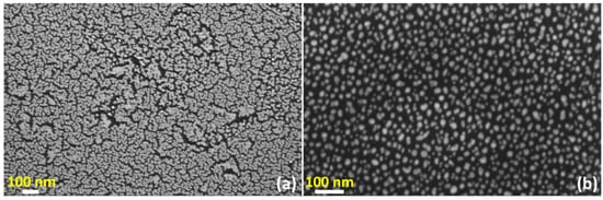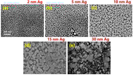 Further increase in the nominal thickness of Ag initially led to the appearance of elongated islands (Figure 9b), followed by the formation of an interconnected network (Figure 9c,d) and a continuous silver layer at a thickness of 30 nm (Figure 9e).