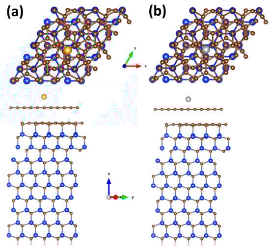 (Top view and side view) The optimized geometrical structures of gold (a) and silver (b) adatoms adsorbed onto monolayer epitaxial graphene. Blue, brown, and whitish balls designate Si, C, and H atoms, respectively. Yellow and gray colors correspond to gold and silver, respectively. This figure has been adapted with permission from [49]. Copyright 2021 WILEY-VCH Verlag GmbH & Co. KGaA, Weinheim, Germany.