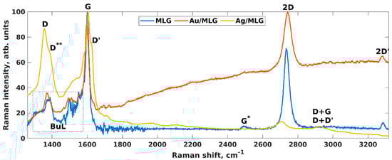 Typical Raman spectra of pristine epitaxial graphene, 2 nm-Au-covered epitaxial graphene, and 2 nm-Ag-covered epitaxial graphene, respectively. This figure has been adapted with permission from [49]. Copyright 2021 WILEY-VCH Verlag GmbH & Co. KGaA, Weinheim, Germany.