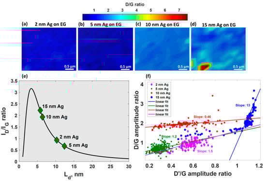 Careful analysis of defect-related Raman modes of epitaxial graphene after silver deposition enabled the estimation of the density of generated defects and elucidate their nature [47]. It was revealed that the D/G intensity ratio is very sensitive to alternation of the silver thickness (Figure 10a–d), demonstrating obvious enhancement with increasing of Ag-layer thickness.
