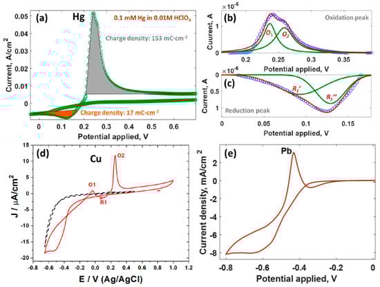 Figure 11 demonstrates a summary of cyclic voltammetry measurements performed to study the reduction–oxidation behavior of mercury, copper, and lead.