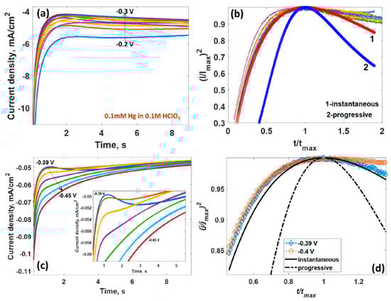 Current transients recorded on epitaxial graphene electrodes during mercury [51] (a,b) (Copyright 2019 by the authors) and copper [52] (c,d) (Copyright 2020 by the authors) electrodeposition. (b,d) also encompass the comparison of the normalized current transient curves with theoretical curves determined by the Hills–Scharifker methodology.