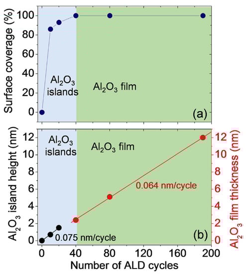 (a) Surface coverage (in %) of ALD-deposited Al2O3 on epitaxial graphene/SiC versus a number of ALD cycles. (b) Dependences of the height of Al2O3 islands (left scale) and Al2O3 film thickness (right scale) on the number of ALD cycles [59]. Copyright 2020 Elsevier Ltd., Amsterdam, Netherlands.