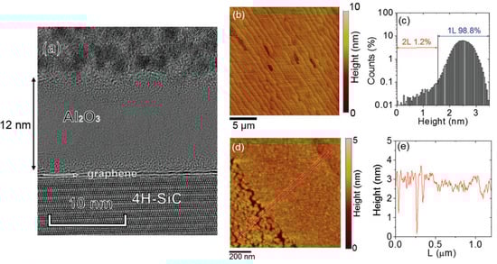 Such a fast transition of the growth mode can be interpreted by the existence of a high density of nucleation centers on the epitaxial graphene surface during early growth stages, which is uncommon for other types of graphene, especially for free-standing exfoliated graphene. This experimental finding is reinforced by the current maps (at a bias Vtip = 1 V) measured by conductive-atomic force microscopy (C-AFM) on epitaxial graphene before and after deposition of Al2O3. The surface of the as-grown (pristine) epitaxial graphene on SiC demonstrates largely uniform conductivity over the scanned area, while the sample subjected to 40 ALD cycles exhibits close-to-zero current, indicating the formation of an insulating film. Obviously, epitaxial graphene on 4H-SiC makes it possible to form highly uniform Al2O3 thin films without pre-functionalization or seed layers [44]. A cross-sectional TEM image (Figure 14a) of the Al2O3/epitaxial graphene/SiC structure clearly shows uniform contrast over the whole amorphous Al2O3 layer, pointing out a uniform density of the material formed during seed-layer-free ALD. AFM measurements (Figure 14b,c) showed that the topography of the formed Al2O3 layer resembles the terrace-stepped morphology of pristine epitaxial graphene, indicating a small roughness of the ALD-grown film. It is interesting to note that the growth of Al2O3 on bilayer inclusions was also identified (Figure 14d,e). However, in comparison to the densely packed grains on monolayer epitaxial graphene regions, Al2O3 on bilayer graphene regions develops into larger grains with obvious separations. Such an effect can be ascribed to higher reactivity of monolayer graphene than that of bilayer or multilayer graphene.
