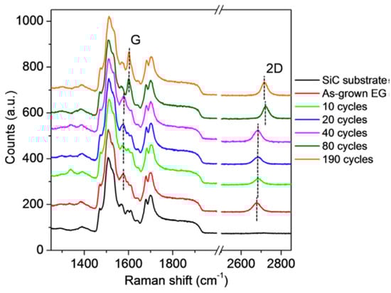 Typical Raman spectra of monolayer epitaxial graphene before and after Al2O3 deposition with 10, 20, 40, 80, and 190 ALD cycles. Raman spectrum of the graphene-free 4H-SiC sample is also shown [59]. Copyright 2020 Elsevier Ltd., Amsterdam, Netherlands.