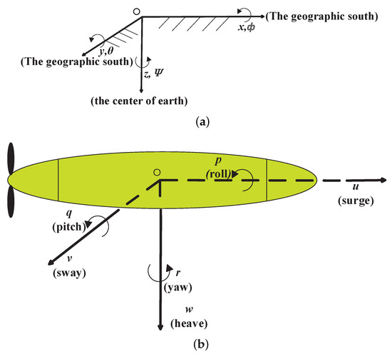 To describe the motion of the AUV in three-dimensional (3D) space, two coordinate systems are usually required (Figure 1). The first one involves the earth-fixed frame , while the other one is the body-fixed frame . Specifically, in Figure 1a, the position and orientation of the AUV can be defined by the earth-fixed frame, while in Figure 1b, the body-fixed frame as a moving coordinate system describes the AUV velocity and acceleration. Since an AUV motion involves of six degrees of freedom (6-DoF), its dynamics can be written as follows [30]: