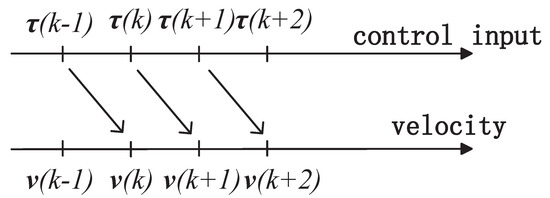 For the sampling time T, the control input generated from the discrete-time controller is considered to be constant during the sample interval, on account of zero-order holder (see Figure 2). Thus, the control input remains constant from time to time . The relationship between the control input and the consequent velocity is presented in Figure 3.