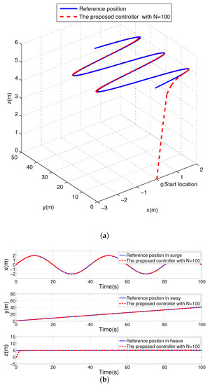 AUV position tracking for noise case 3 (T = 0.01 s and N = 100): (a) 3D position tracking and (b) tracking in surge, sway, and heave.
