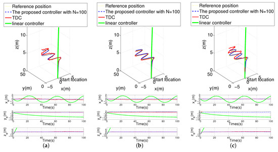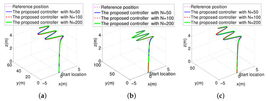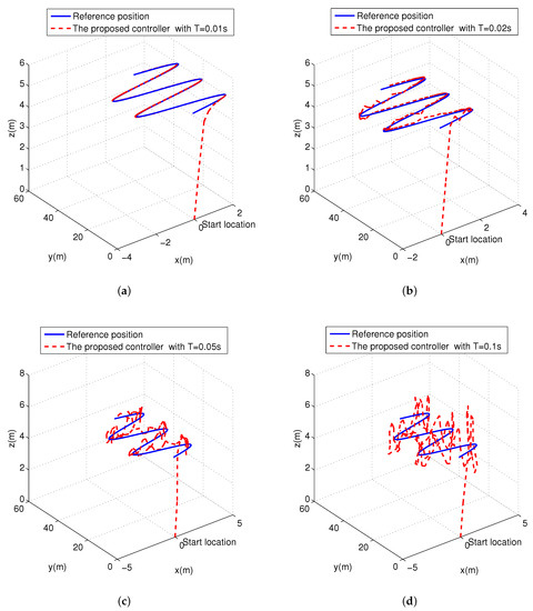 It is well known that different sampling times have a great impact on the performance of position tracking. For this trial, N is set to 100 and case 1 is chosen as the noise condition. Then, the proposed controller is tested for different sampling times T, i.e., 0.01 s, 0.02 s, 0.05 s, and 0.1 s. Figure 5 presents the 3D position tracking for the corresponding sampling time T. The latter figure highlights that the position tracking degrades as the sampling time increases. This happens not only because of the discrete-time controller, but also because of TDE. Accordingly, when the sampling time increases, is not approximately equal to .