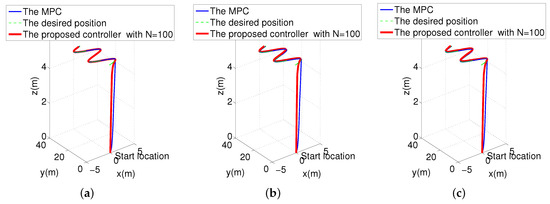 Figure 8 presents the 3D position tracking results under various noise conditions, and Table 7 illustrates the RMS errors at a steady state for the MPC controller and the proposed controller. It indicates that the MPC controller and the proposed controller both precisely track the truth positions. Given that the suggested method meets the requirement of high tracking accuracy, the performance of the calculation time is examined, in particular. Table 8 presents the average calculation time of the MPC controller and that of the proposed controller in a single step for noise cases 1–3, highlighting that MPC imposes the highest computational burden, prohibiting it from real-time applications. The proposed controller manages at least 89.5% less average processing time over the conventional MPC controller. Hence, in practical applications, the proposed controller can offer high timeliness.