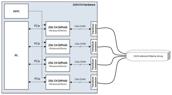 Several 1024-channel multi-channel platforms have been presented in the past, which allow the use of a matrix array [8,9,10,11]. Often these systems are very complex using multiple linked ultrasound research systems that cannot be controlled by a single computer. This complicates the possibilities for programming and processing as well as performing clinical research regarding basic safety for patients and users using such an experimental setup.