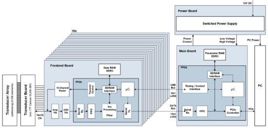 Each of the four 256 channel ultrasound systems is modular in design (Figure 2). They consist of 16 front-end boards, which integrate 16 transmit and receive channels each; a main board, which handles the entire control and data management of the sub-system; a transducer connector board, which collects the individual signal lines of the front-end boards and leads them to a transducer connector; as well as a power supply developed in-house.
