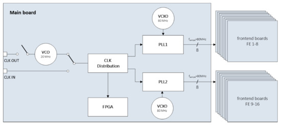 In addition to the parameterization of the transmit and receive characteristics and the data management on the receive side, the main board is also responsible for the synchronization of the 256 parallel channels of the sub-system. A high-precision clock network was set up for this purpose. When digitizing ultrasound signals, the choice of a suitable clock is essential in order not to affect the performance of the receiver’s A/D converters. To ensure a high resolution, the applied clock must have only small phase variations. However, clocks generated by an FPGA are generally subject to comparatively high phase fluctuations. Therefore, two 14-channel clock generators of the type AD9523 from the manufacturer Analog Devices are used on the main board, which have an extremely low broadband jitter < 100 fs; i.e., they can generate very clean clocks. Each of the two clock generators integrates two PLLs and a clock distributor. To reduce phase noise and thus improve the signal-to-noise ratio at the A/D converter, an external, frequency-stable, voltage-controlled crystal oscillator (VCXO) is used to generate a clock of 80 MHz. A reference frequency of 20 MHz is applied to the input of the clock generators, which is generated by a VCO and fed via a clock distributor to the two clock generators and as a system clock to the FPGA of the main board. Both PLLs generate eight in-phase 80 MHz clocks each, synchronized to the input clock, which are routed via LVDS lines to the individual A/D converters on the front-end boards (Figure 3). In the layout, conscious care was taken to ensure that the signal line lengths to the individual front-end interfaces are practically identical.