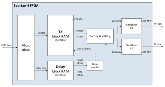 To store the transmit patterns, a separate FPGA internal block RAM (16 × 2048 bit) is used for each channel. This has the advantage that during the transmission phase a signal can be read out individually from the memory for each channel at different times. Thus, it is possible to first count down the coarsely resolved delay values, which are stored in a separate internal block RAM (16 × 1024 bit) per channel, using a 60 MHz clock accuracy. After this, the actual transmit signal is read out from the transmit memory at a clock rate of 120 MHz and routed to the external pulser output stages via 4:1 serializers at a high clock rate of 480 MHz. To realize a high delay resolution, a specially developed sorting algorithm is used. In addition to the coarse delay already counted down, this algorithm shifts the transmit signal read from the memory by several 120 MHz clocks, depending on the delay set, before the signal is then clocked out at high resolution by the serializers at the I/O interfaces. Shift operators and an AND gate are used in the FPGA for this purpose. This principle allows a high delay resolution of 2 ns to be achieved. In total, transmit patterns with up to 32 µs signal length can be stored in the transmit memories per channel, together with a total of 1024 different delay values.