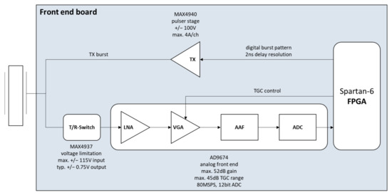 The front-end board integrates the analog/digital interfaces for a total of 16 parallel transmit and receive circuits each. A Spartan-6 FPGA with integrated MicroBlaze soft processor (running at 50 MHz) is used for control and data processing. The front-end FPGA, synchronized and controlled by the main board FPGA, handles the entire timing of a scan, such as pulse-echo measurement. For this purpose, a corresponding state machine consisting of reset, initialization, transmit and receive phases (user configurable), as well as a wait state, was implemented.