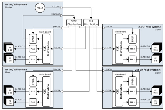In this way, all 1024 elements of the matrix array can be addressed individually and in parallel without using a multiplexer. The synchronization of the four sub-systems is achieved by a separate synchronization circuit. Here, one system acts as the master and generates the 20 MHz master clock with which all systems are operated. In addition, the Virtex-6 FPGA of the master system generates a coded 1 MHz synchronization signal, which also serves as a trigger for an ultrasound measurement scan. The master clock and synchronization signal are passed on to the individual sub-systems via a distribution circuit. Compared to Figure 3 in Section 2.3.1, the on-board generated clock is no longer used to drive the PLLs. Instead, the external clock, which is distributed to the individual systems, is applied via the CLK IN input by selecting it with a switch. The master system itself also receives the two signals again as input to ensure phase equality with the other sub-systems in the sequence control. Other research groups, such as those around the platform ULA-OP, are also pursuing similar approaches [18]. While our method is based on synchronous distribution of clock and trigger signals with equal signal run lengths, ULA-OP’s synchronization circuit relies on PLLs with a programmable phase shift and on a trigger delay compensation to realize zero delay of the timing signals between the master and slave systems.