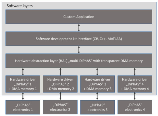 Even though the system consists of four synchronized electronics units, the software is implemented to control a “synchronized multi DiPhAS” unit that transparently handles the programming of all 1024 channels for the user. The software internally manages which delays to send to which system and combines the measurement data stored in multiple DMA memory blocks (Figure 7).