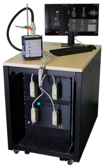 One goal in the development was to integrate the 1024-channel system into a standard 19-inch rack case (Figure 8) that can be used as a single ultrasound system even for clinical studies after normative testing regarding electrical safety and electromagnetic compatibility. The mobile rack system on wheels is equipped with telescopic levels in a way that the individual sub-systems and the PC can be easily accessed and maintained. Due to the movable concept, the system can be transported very comfortably from one room to another. In total, the cart has a height of 800 mm.