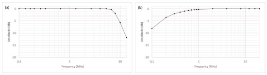 To determine the receive bandwidth, the high-pass filter integrated in the receiver module was deactivated. Then, a sinusoidal signal, generated by an external signal generator, was fed into the transducer connector of the system. Whereas in older DiPhAS generations the signals were already significantly attenuated below 1 MHz, here the −3 dB limit is undercut below 300 kHz (Figure 9). Overall, the system can therefore be operated in a frequency range between 300 kHz and 25 MHz, provided that in the upper frequency range the sampling of 80 MS/s is still acceptable in the respective application.