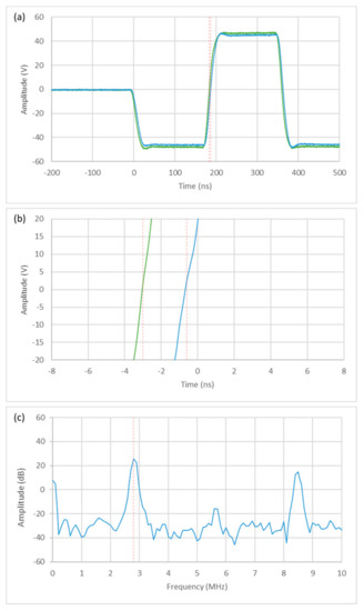 Another innovation in the development of the 1024-channel electronics was the implementation of an FPGA-based transmit signal generation with a high delay and frequency resolution of 2.08 ns (using a clock of 480 MHz). This was verified by generating and analyzing two signals with the smallest possible phase shift at the output pins of a front-end board using an oscilloscope (Figure 10). In addition to the time shift of two transmit signals, the spectrum of the excitation frequency of the Vermon 32 × 32 element Matrix Array of 2.82 MHz was also recorded to demonstrate the frequency accuracy.