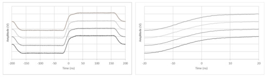 Probably the most important feature of the parallel connection of four 256-channel systems to one 1024-channel ultrasound electronics is the guarantee of completely synchronous operation. The developed synchronization scheme has already been sufficiently described in Section 2. To analyze the synchronization of the four parallel sub-systems and to exclude any phase shift or jitter with a set zero-delay plane wave ultrasound beam, one transmit signal of a randomly selected channel was measured from each 256-channel system, which were then compared with each other in time (Figure 11).