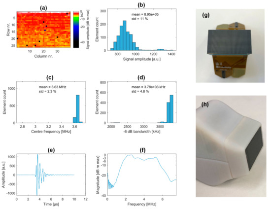 Array statistics and integration. Array performance with color-coded element-wise signal amplitude (a) and the corresponding histogram (b). Center frequency and bandwidth statistics are given in (c,d). Single element response measured against the steel reflector (e) and average element transfer function (f). Acoustic block prior (g) and after housing integration (h).