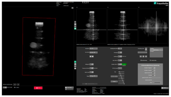 The implemented signal processing and image generation pipeline is working in real-time (Figure 13) and the resulting frame rate of volume updates depends on the amount of measurements performed to combine each volume. Using a Biquad-based IIR filter with a lower frequency cutoff of 1 MHz and a Q value of 0.7 already filters out the DC offset of each digitized channel separately, with approx. −60 dB. In the same way, a high-pass filter is used to remove high-frequency RF noise at frequencies higher than 13 MHz. These filters are applied on the single element channel data before beamforming and again on radio-frequent data after beamforming to eliminate the accumulated offsets.