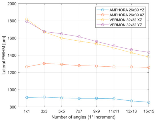 As can be seen in Figure 14, the FWHM (−6 dB width of the PSF) is reduced with an increasing number of plane wave angles, especially in the case of the Vermon 32 × 32 transducer, while it remains almost constant in the case of the custom AMPHORA 26 × 39 transducer. This can be explained by the different element sizes, leading to a much smaller element opening angle in the case of the AMPHORA transducer. Consequently, angular compounding is much less efficient when it comes to the improvement of the PSF in this case. For the Vermon probe, having comparable aperture sizes in both directions, the PSF ranges between 1800 µm and 1400 µm for the 1 × 1 to 15 × 15 angles, respectively, independently of the orientation.