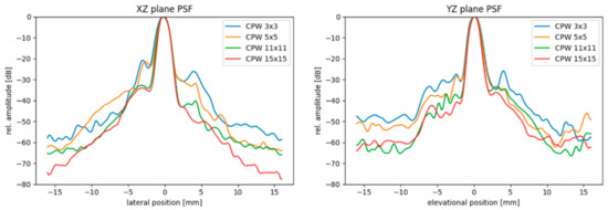 The system imaging performance was characterized using the point-spread function (PSF) analysis with different plane wave compounding experiments for both the Vermon 32 × 32 and our custom AMPHORA 26 × 39 element matrix array transducer described above. As both transducers do not have a square aperture (Vermon has three inactive rows in-between, resulting in a larger footprint in elevational direction), the PSFs were measured with a wire phantom in two orientations, 0° and 90°, with the wire being at a depth of 35 mm and orthogonal to the XZ in one and orthogonal to the YZ imaging plane in the other setup. After volumetric reconstruction of 1 × 1, 3 × 3, 5 × 5, 7 × 7, 9 × 9, 11 × 11, 13 × 13 and 15 × 15 transmit-receive events, with a plane wave increment of 1° per angle step and coherence receive beamforming, the analysis was performed in the XZ and YZ imaging planes (Figure 14).