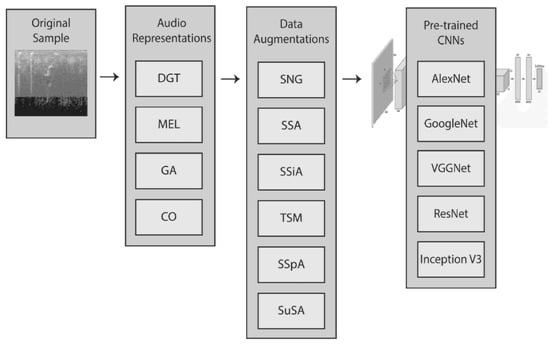 The goal of this work is to perform an extensive study of CNN classification using different architectures combined with an investigation of multiple sets of different data augmentation approaches and methods for representing audio signals as images. Building such ensembles is motivated by two observations: (1) it is well known that ensembles of neural networks generally perform better than stand-alone models due to the instability of the training process [], and (2) it has been shown in other classification tasks that an ensemble of multiple networks trained with different augmentation protocols performs much better than do stand-alone networks []. The classification scores of the CNNs are combined by sum rule and compared and tested across three different audio classification datasets: domestic cat sound classification [,], bird call classification [], and environmental noise classification [].