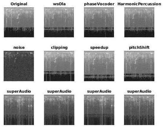 This protocol applies the five algorithms contained in the time-scale modification (TSM) toolbox []. TSM methods (samples in Figure 2) are commonly used in music production software to change the speed of signals without changing their pitch. Since two different constant stretching factors (0.5 and 1.8) were used for each TSM method, this augmentation approach produced ten new images. For a detailed description of the TSM toolbox, see []. A brief description of the five TSM algorithms follows: