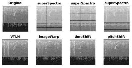- VocalTractLengthNormalization (apply VTLN) creates a new image by applying VTLP [], which divides a given spectrogram into 10 unique temporal slices. Once so divided, each slice passes through the following transformation:where , are the basic and maximum frequency, and is randomly chosen. In this study, a and b are set to 0.9 and 1.1, respectively;