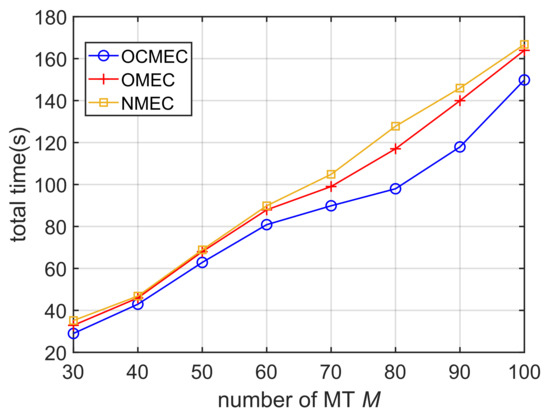 With the increase of M, the total load of the system increases. When , because of the low task load, the gain effect of OCMEC on reducing the delay is relatively low; when , the task load increases continuously, and the total time-consuming gap between OCMEC and NMEC is increasing, and the gain effect of reducing the delay is getting better and better. When , the total load exceeds the capacity of MEC-BS and MEC-NBS, and they cannot fully meet the calculation requirements of the tasks, so the total time gap gradually narrows, and the gain effect for reducing the delay gradually decreases.