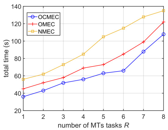 With the increase of R, the total load of the system increases. When , because of the low task load, the gain effect of OCMEC on reducing the delay is relatively low; when , the task load increases continuously, and the total time-consuming gap between OCMEC and NMEC is increasing, and the gain effect of reducing the delay is getting better and better. When , the total load exceeds the capacity of MEC-BS and MEC-NBS, and they cannot fully meet the calculation requirements of the tasks, so the total time gap gradually narrows, and the gain effect for reducing the delay gradually decreases.