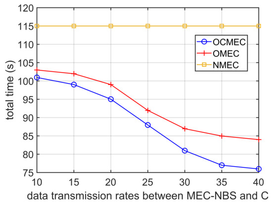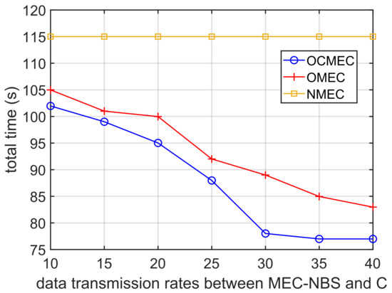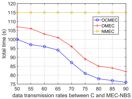 Similar to the data transmission rates between MEC-NBS and C, and impacts the time consumptions of transmission processes in further offloading and data caching. The overall trend of the curves of OCMEC and OMEC are decreasing. Similarly, the curve of NMEC is still unchanged because further offloading and data caching are disabled.