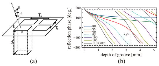 The depth of phase element is tuned and the antenna frequency is also changed to confirm the sensitiveness of reflected phases from 80 to 110 GHz. The antenna frequency is selected by 95 GHz to reduce atmospheric propagation loss. The depth of each waveguide, d, is changed for under half of the guided wavelength for the antenna frequency (0 ≤ d < ). The reflected phase can be fully satisfied from − to due to the ground-plane reflection, which is the round trip propagation in each metal waveguide. A perfect electric and magnetic conductor with a periodic boundary condition of a -polarized wave is used for electromagnetic full-wave simulation, CST Microwave Studio. Rectangular metal waveguide grooves are equally spaced arrays in an aluminum metal plate.
