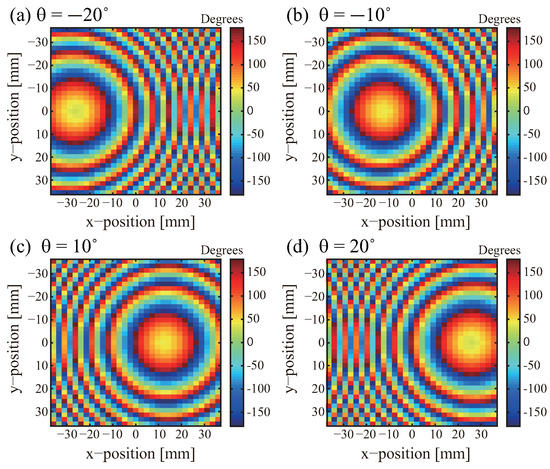 Required phase patterns for reconfigurable millimeter-wave reflectarray antennas from = −20 to 20 (a) = −20; (b) = −10; (c) = 10, (d) = 20.