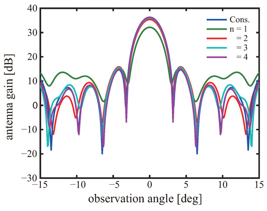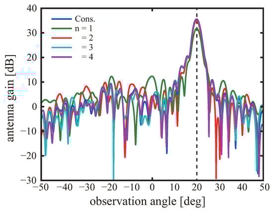 Figure 4 shows the simulated radiation patterns of digitized reflectarray antennas when all required phases for high-gain antenna are quantized by the number of bits, n. Increase the number of quantized bits higher than the gain of designed reflectarray antennas. The radiation characteristics of digitized metal reflectarray are comparable when the required phase of groove is quantized by four bits. This means that the 16-depth elements are sufficient for high-gain reflectarray. Moreover, the digitized metal reflectarray is easily constructed with only two bits in 1 dB-loss circumstance, which results in the reduction of the manufacturing time and cost [19]. Figure 5 shows the calculated four required phase patterns for digitized 20-steered metal reflectarray antennas for non-digitized cases and three different bits.