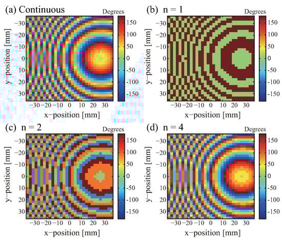 Required phase patterns for 20-steered digitized metal reflectarray antennas for a non-digitized case and three different bits, n = 1, 2, and 4.