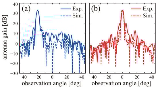 Experimental (solid) and simulated (dashed) far-field radiation patterns of proposed two-bit digitized reconfigurable reflectarray antennas when two different observation angles are applied. (a) = −20; (b) = 0.