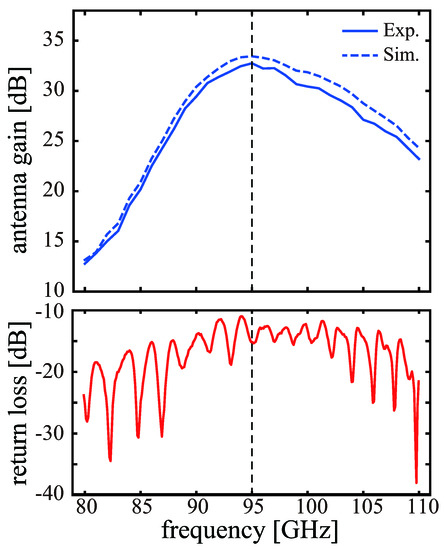 The measured −20-aimed antenna gain and return loss for the frequency range of 80∼110 GHz with the simulation results is shown in Figure 9. The measured gain below 95 GHz shows a good agreement with the simulated one, but the difference is increased at the higher frequency range due to the phase error of a blockage and a diffraction caused by the waveguide flange and the supporting strut. Nevertheless, the 1-dB gain bandwidths of a designed metal reflectarray antenna from experimental and simulated results are about 6.2% (92.3∼98.2 GHz) and 5.3% (92.7∼97.7 GHz), respectively and return loss was less than about –10 dB in 80∼110 GHz.