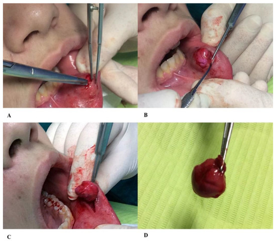 (A) After insertion into the lumen of the hydrocolloid material injury impression, we proceeded with the dissection of the flap through scissors with rounded ends and (B) the removal of the cyst wall, (C) preserving the healthy surrounding tissue. (D) The complete removal of the cyst wall is the key to preventing recurrence of mucocele.