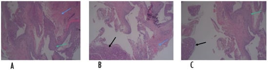 Histological slides of the cyst specimen. Black arrows (B,C) indicate benign salivary gland tissue, green arrows (A,C) indicate foamy microphages, blue arrows (A,B) indicate skeletal muscle fibers.
