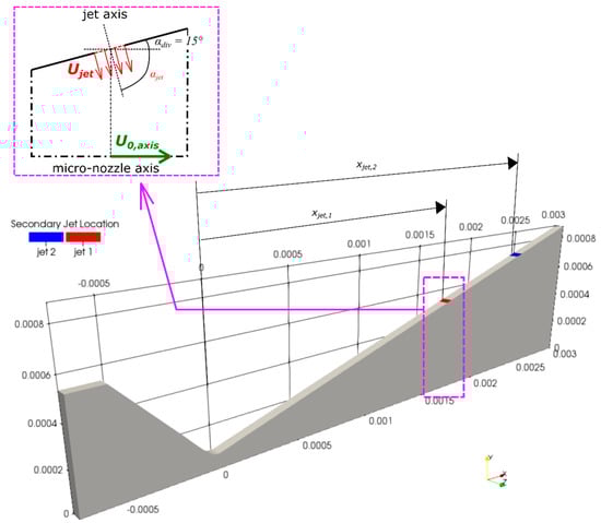 Concerning the configuration of the secondary injection system, two micro-jets, from here on denoted as “jet 1” and “jet 2”, have been placed along the sidewalls of the divergent region, with jet centerlines located at an axial distance from the throat section, equal to xjet,1 = 1.73 × 10−3 m and xjet,2 = 2.475 × 10−3 m, as shown in Figure 2. As summarized in Table 2, the micro-jets have been injected from micro-channels owning exit cross section of rectangular shape, and dimensions of 40 μm × 120 μm and 50 μm × 120 μm, respectively for jet 1 and jet 2.